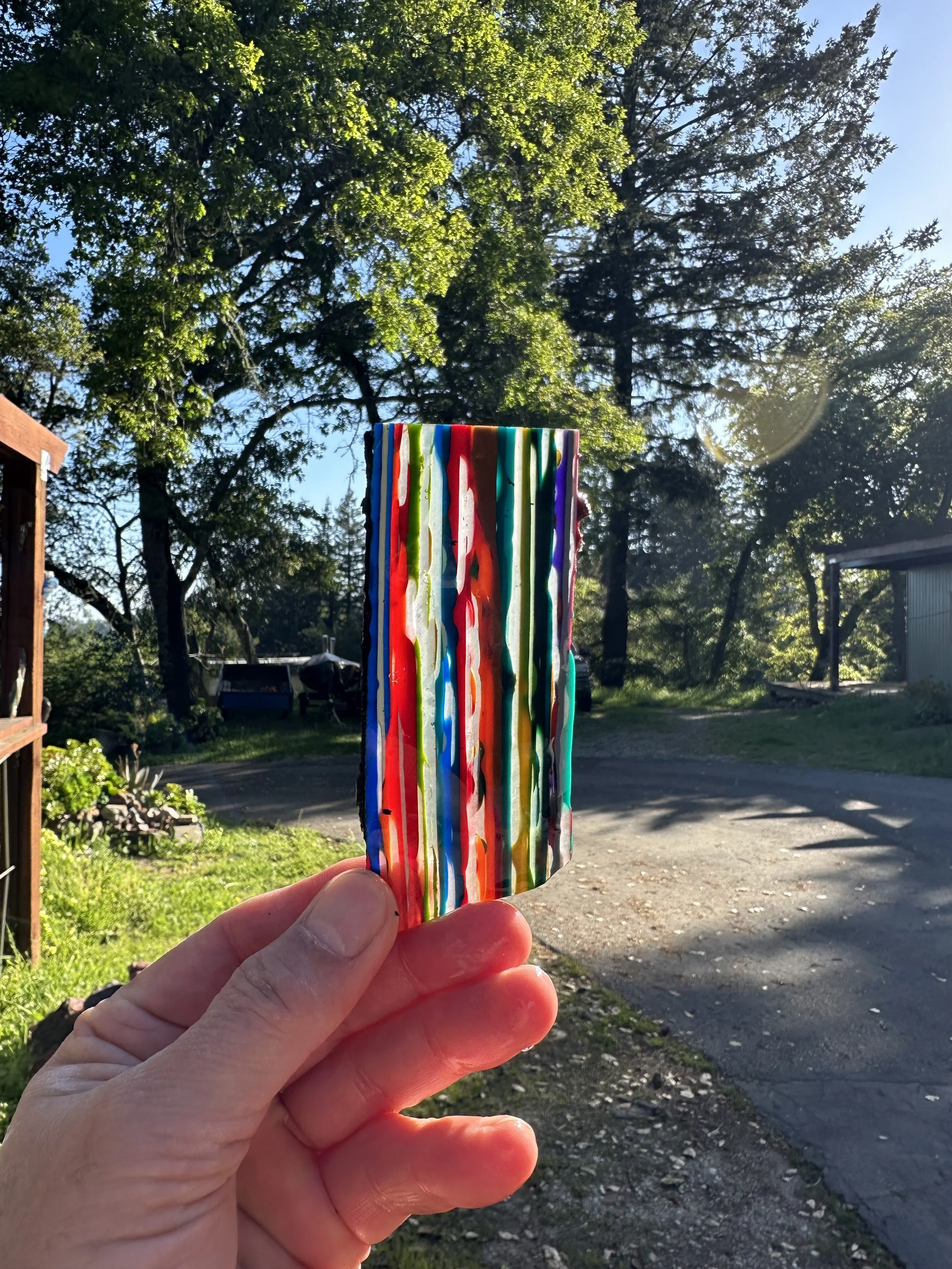 Surfite is a rock like material made from recycled surfboard resin. At a surf shop, when making boards they pour the colored resin over the base, and the excess resin drips off onto the ground, and over time, this forms many layers of resin in a solid form. These scraps are then collected by artists and collectors, which can be cut and polished into slabs to make many forms of art, most commonly jewelry.